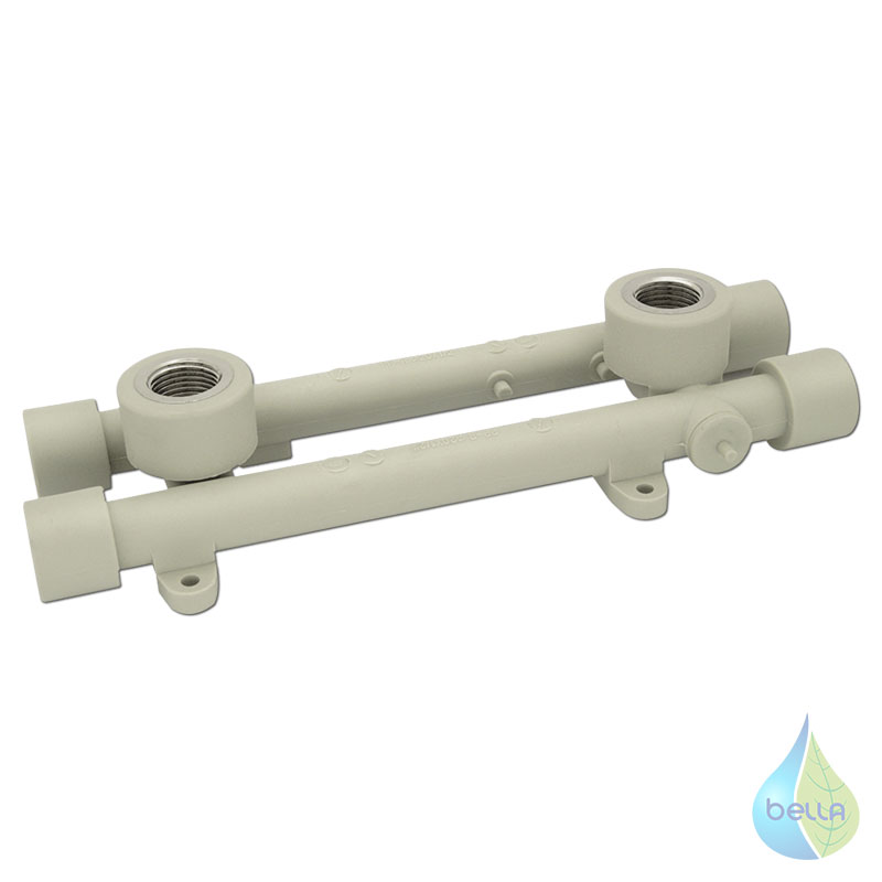 PPR nástenný komplet je určený na spojenie plastového potrubia závitovým spojom, napríklad pre montáž nástenných batérií, alebo rohových ventilov. Šírku montáže je možné nastaviť v rozsahu 100 a 150 mm. Je vyrobené z polypropylénu a závitová časť je mosadzná s povrchovou úpravou nikel.